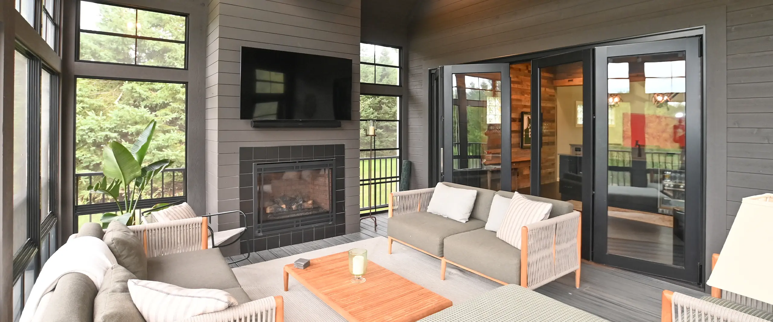 Three-Season Screened Porch โ The spacious area surrounded by porch conversion windows, vaulted ceilings, and custom barn wood beams includes a gas fireplace, with a television above, and plenty of seating. The porch conversion windows allow for screen only or retractable windowpanes during inclement weather.