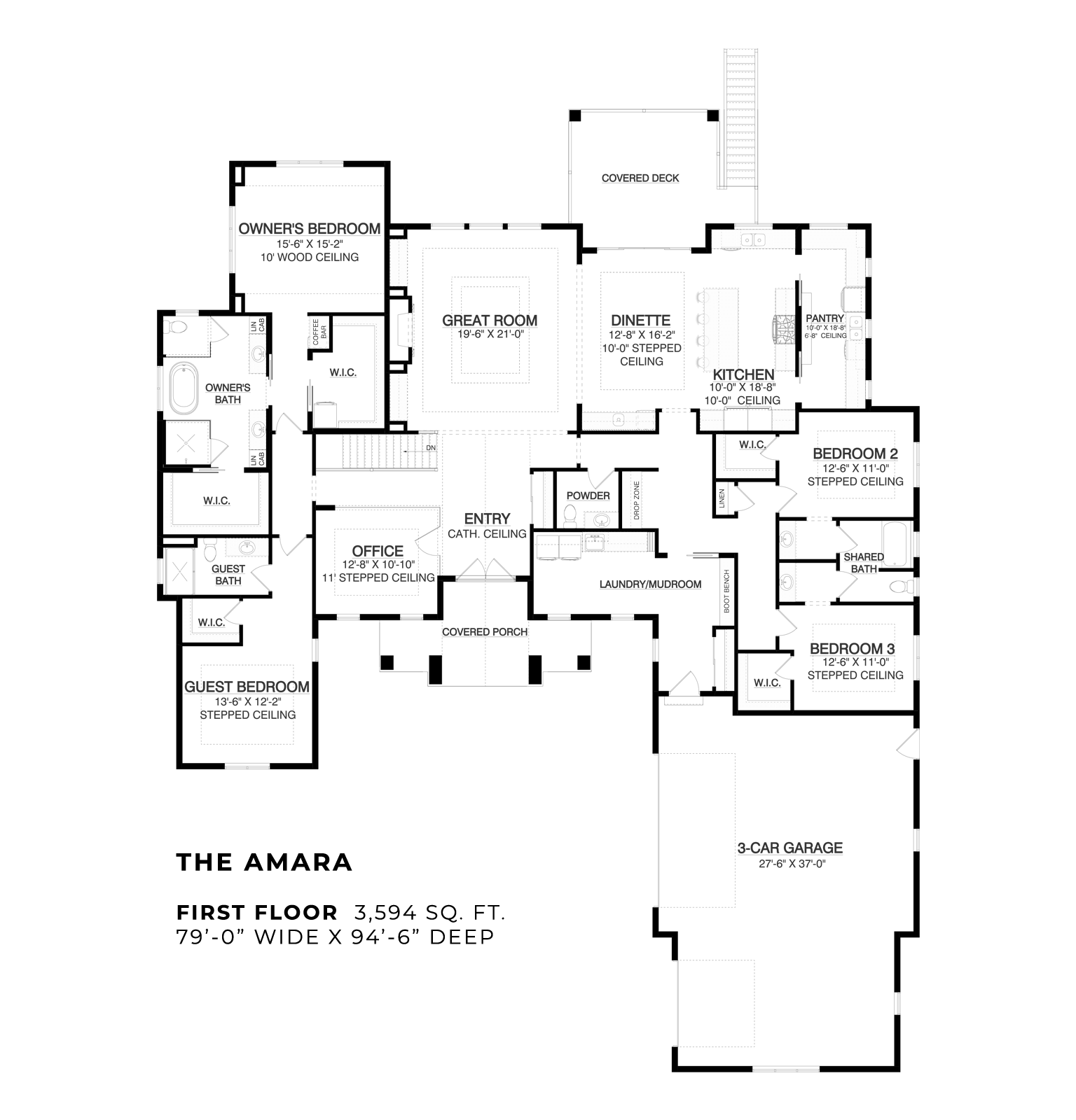 The Berkley is complete with three first-floor bedrooms, each with an attached full bathroom and walk-in closet, providing convenience and privacy. The owner’s suite is luxurious and comfortable, with lighter elements and warm wood tones. Relax at the end of the day in the spa-like owner’s bath, featuring another cathedral ceiling, gorgeous tiling, and pebbled rock flooring in the shower. Through the bathroom, enter the spacious walk-in closet. Stay organized with the closet’s island, where you can store shoes or accessories.