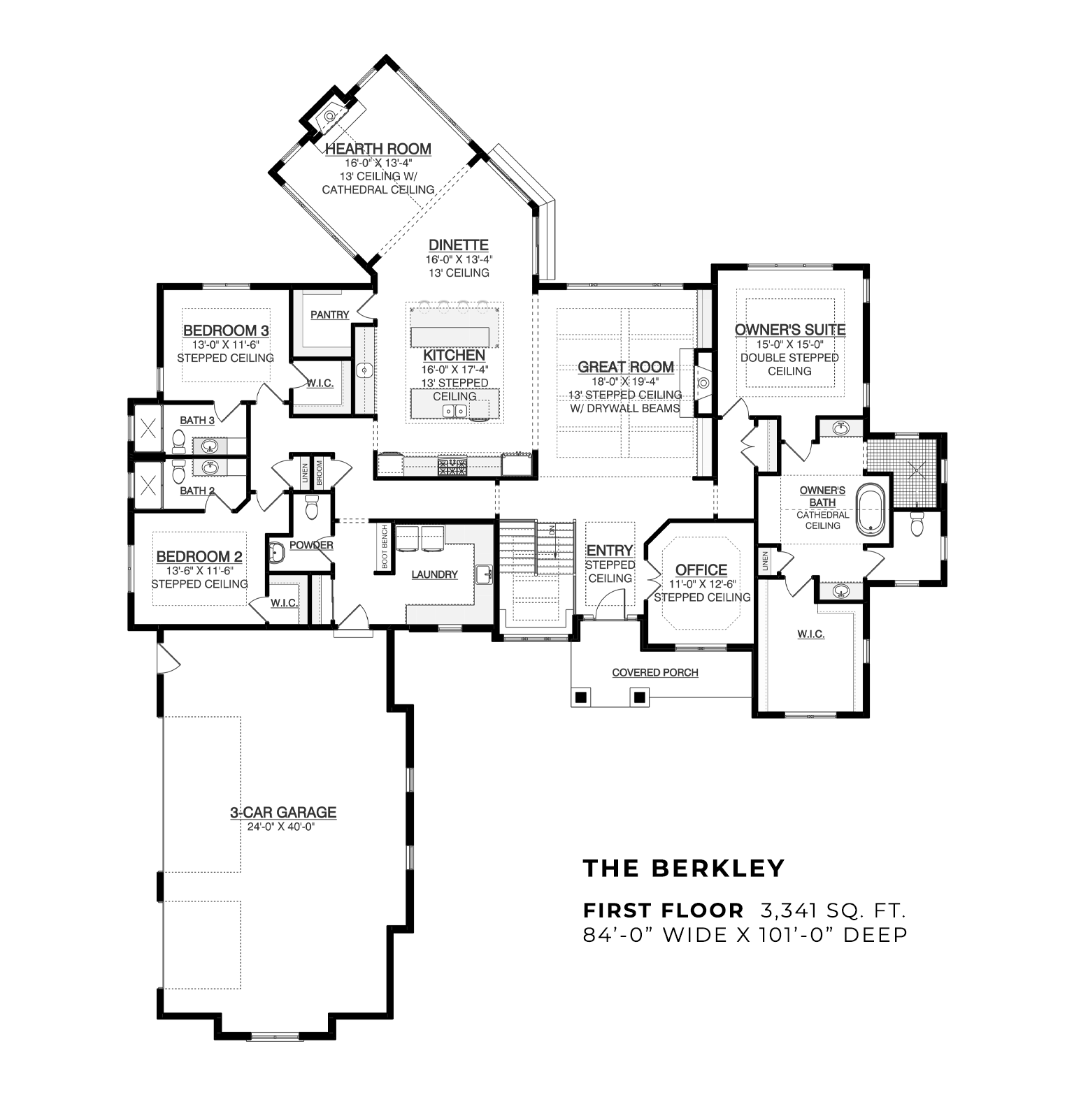 The Berkley is complete with three first-floor bedrooms, each with an attached full bathroom and walk-in closet, providing convenience and privacy. The ownerโs suite is luxurious and comfortable, with lighter elements and warm wood tones. Relax at the end of the day in the spa-like ownerโs bath, featuring another cathedral ceiling, gorgeous tiling, and pebbled rock flooring in the shower. Through the bathroom, enter the spacious walk-in closet. Stay organized with the closetโs island, where you can store shoes or accessories.