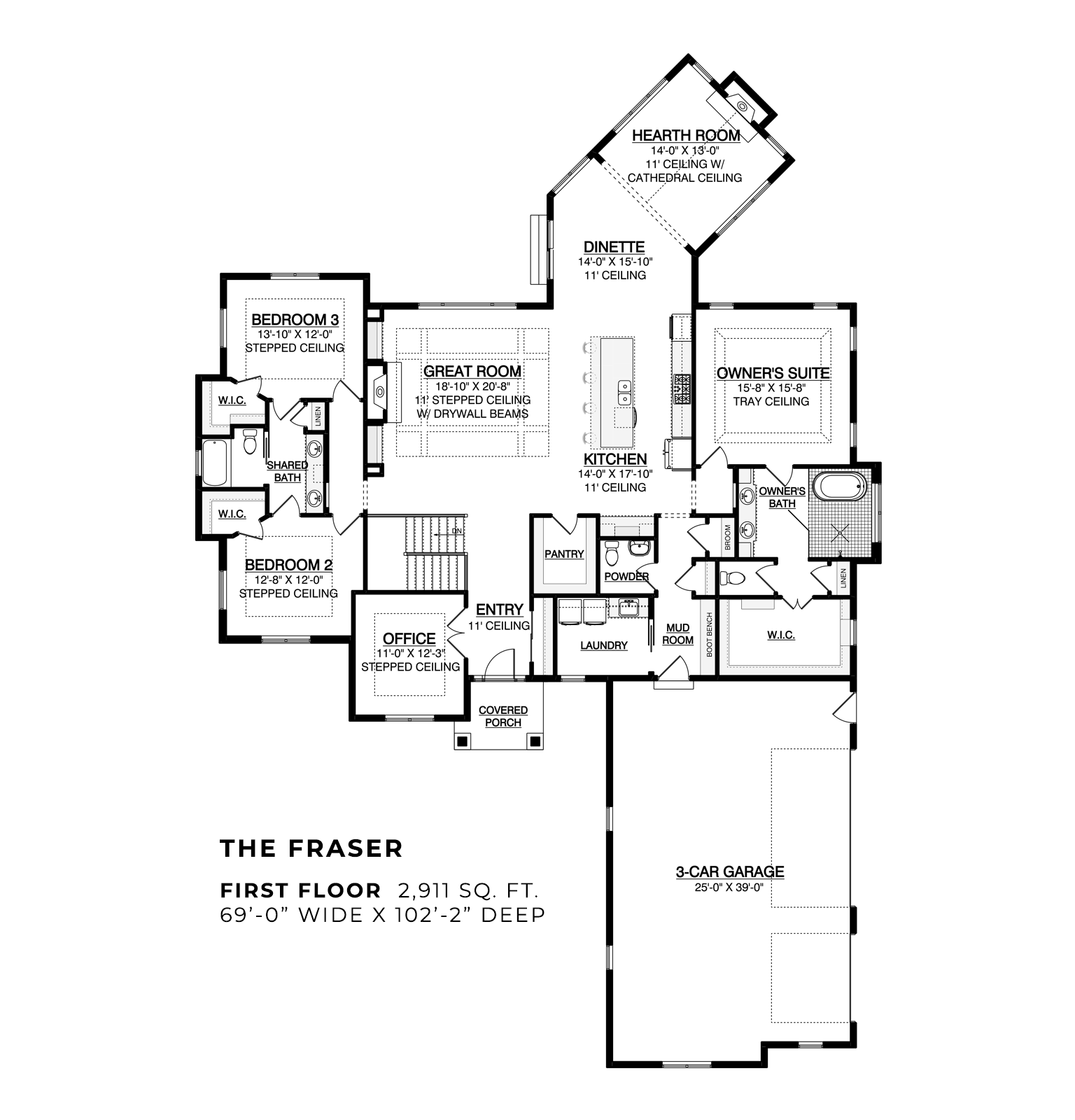 Picture a home that’s custom-made for entertaining family and friends. That’s The Fraser! This stunning ranch-style home boasts lofty 11-foot ceilings in the home office and throughout the open great room, kitchen, and dinette area. The spacious walk-in pantry and the oversized island, complete with a snack bar, make hosting dinner parties a breeze. Curling off the dinette is the real star of this home: a charming hearth room with wood-wrapped beams adorning its cathedral ceiling.