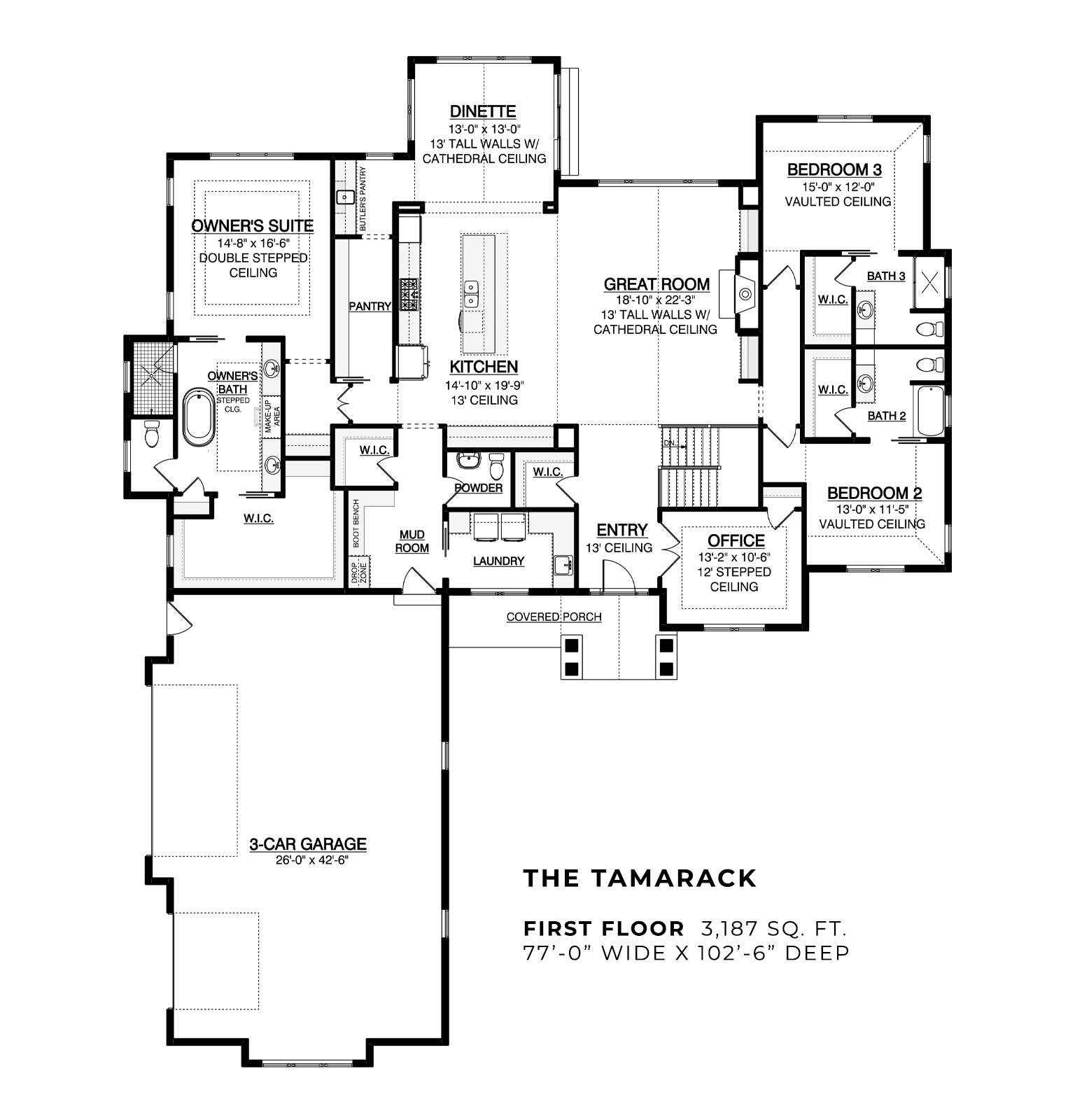 The Tamarackโs stunning ownerโs suite is a private sanctuary, separated from the main living space by a dedicated vestibule. With an accent wall behind the luxurious soaking tub, a walk-in shower, and an oversized walk-in closet, this suite is a true retreat. Bedrooms two and three each offer en-suite bathrooms and walk-in closets, ensuring comfort and privacy for guests or family members.