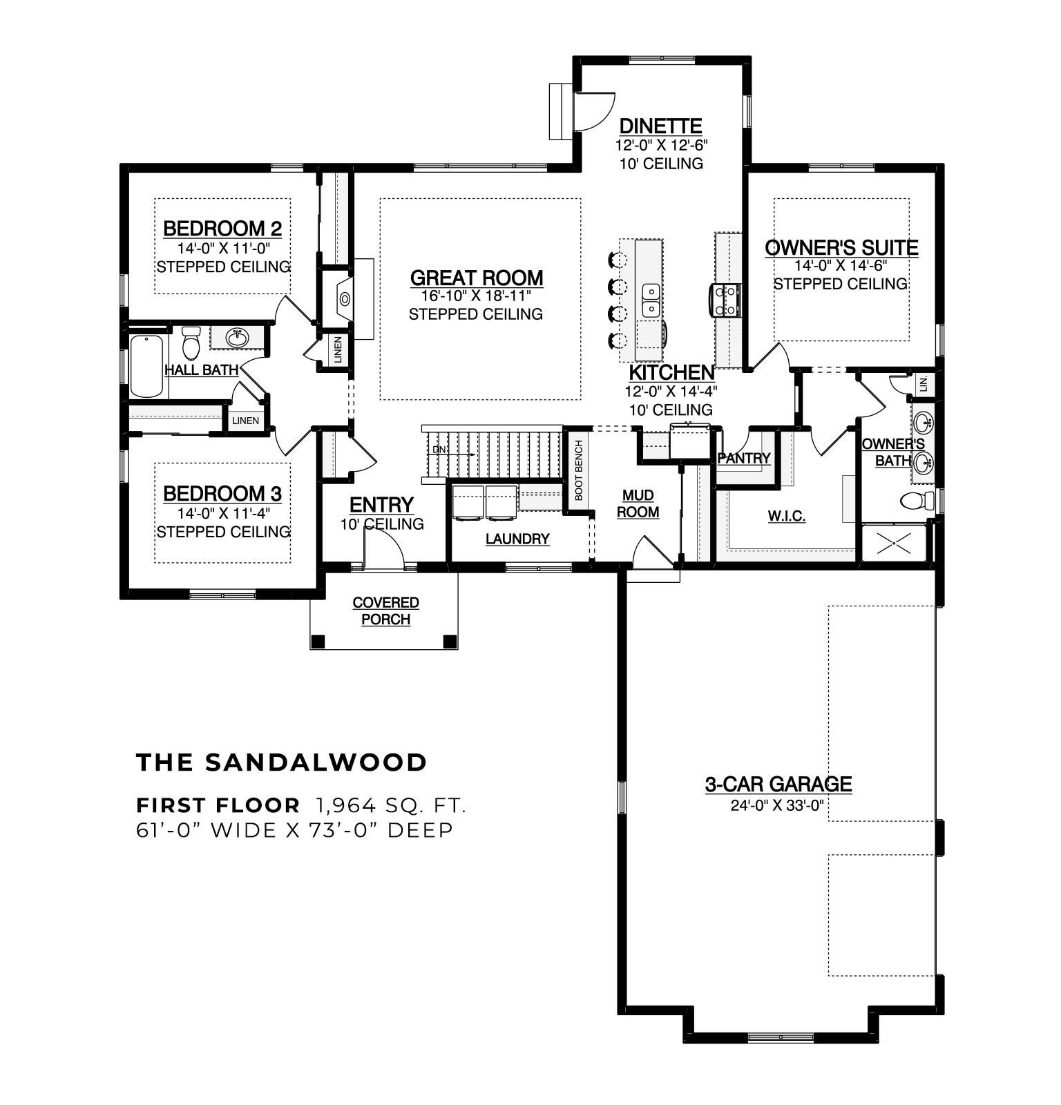 The Sandalwood is the ranch that feels like so much more. The large, open-concept great room with vaulted ceilings provides a generous amount of natural light. Functionality is maximized with kitchen and dinette adjacent to the great room.